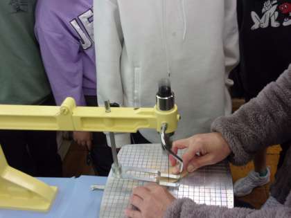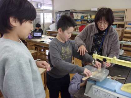 「糸のこスイスイ」の学習で、木の板を糸鋸で様々な形に切って組み合わせ、おもしろい形をつくろうとしています。導入に糸鋸の使い方の指導を受けました。説明をしっかりと聞き、実際に木の破片を切ってみました。最初は恐る恐る触っていた子供も、少し慣れると、直線から曲線にも挑戦するなど、関心を高めて取り組みました。