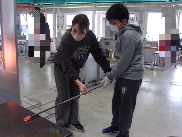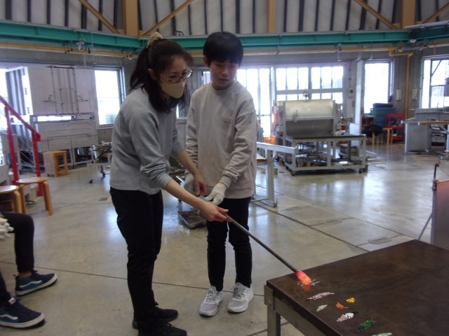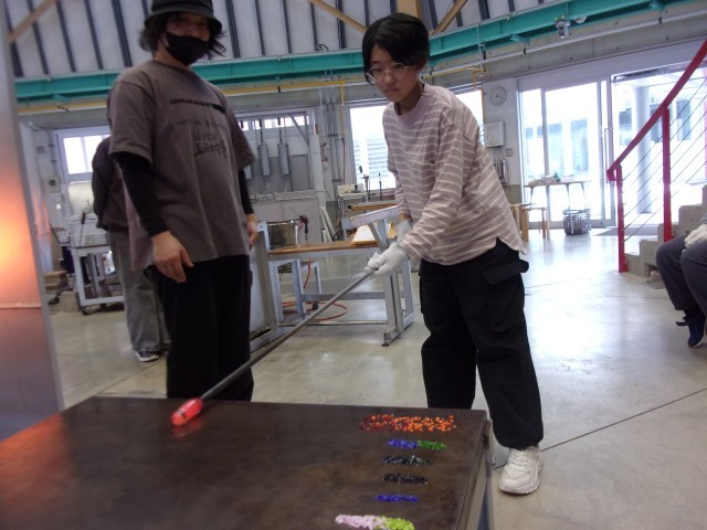 制作の様子です。ガラスだまりから取ったガラスの形を整えながら冷やしたり、色をつけたりしています。