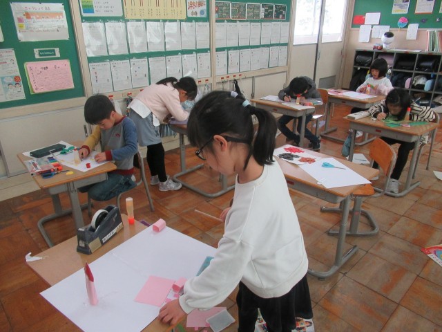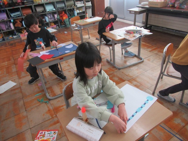 2月19日(水) 1年生 図画工作科の学習の様子 公開日 2025/02/19 更新日 2025/02/19 1年生 図画工作科「おはなし すごろく」の学習の様子です。自分のテーマに合ったマスやコースを考え、色画用紙等を切り貼りして作りました。子供たちは、楽しみながら活動に取り組んでいました。 1年生