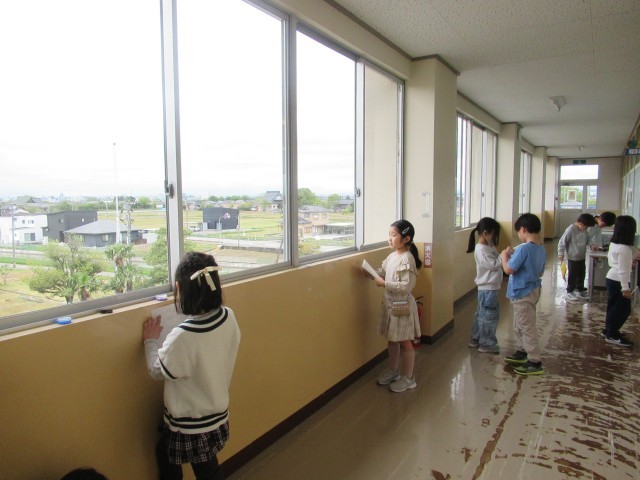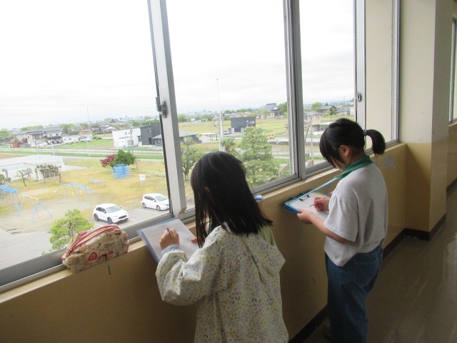 4月25日(金) 3年生 社会科の学習の様子 公開日 2025/04/25 更新日 2025/04/25 3年生 社会科の学習の様子です。3階から学校のまわりの様子を調べました。子供たちは方位磁針で方角を確認しながら、どんなものが見えるのかを調べて、記録していました。 3年生