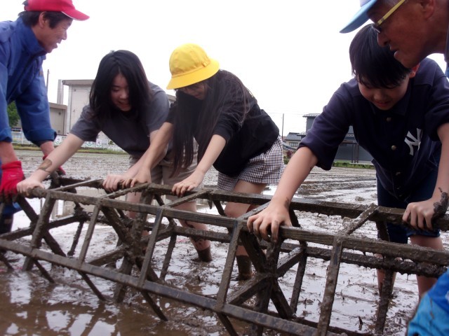 昔ながらの方法の「ころがし」を体験した後には、田植えの機械にも乗車させていただきました。普段経験することのない泥の感触や、一つ一つの苗を腰を曲げながら植える経験を通して、農家の方のご苦労や大変さを実感しました。体験後には、子供たちがこれからの世話の仕方を質問し、今後の「新大正もち」の稲の生長や収穫、冬の餅つき体験が楽しみな気持ちが高まりました。