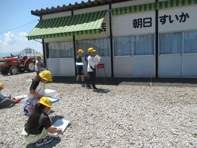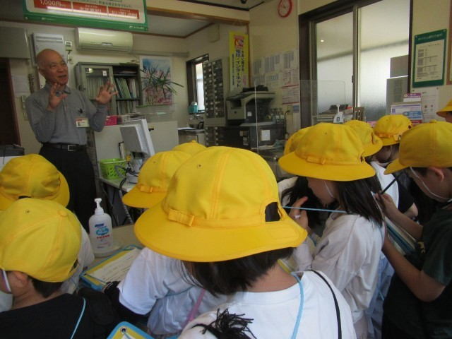 3年生は、総合的な学習の時間に「朝日のすてき」を見付ける学習をしています。今日は町探検をし、朝日簡易郵便局、朝日すいかの直売所、永原農園さん、熊野神社を巡りました。郵便局や農園では、施設の役割や様子について丁寧に教えていただきました。子供たちは、気になったことを進んで質問したり、よく見て記録したりしていました。