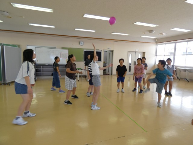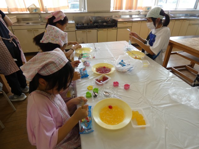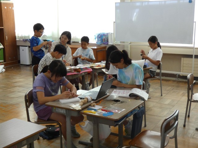 各クラブの活動の様子です。暑さが厳しいため、スポーツとビーチバレークラブは工夫して活動しています。手芸クラブは作業に集中し、クッキングクラブはひんやりスイーツを作っていました。