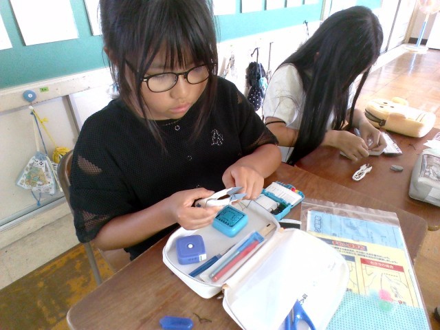 家庭科では裁縫の学習がスタートしています。裁縫用具の安全な使い方を学んだ後、糸通しや玉結び、玉止め、ボタン付けに挑戦しました。思うように針が刺さらなかったり、玉止めが変なところにできてしまったり、糸が途中で絡まってしまったりと、初めての経験で上手くいかないこともありますが、友達同士で教え合いながら根気強く取り組んでいます。