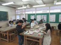 英語で考えた自分の好きなもののクイズを出し合う活動の様子です。色や形、大きさな...