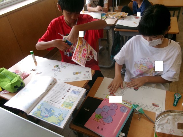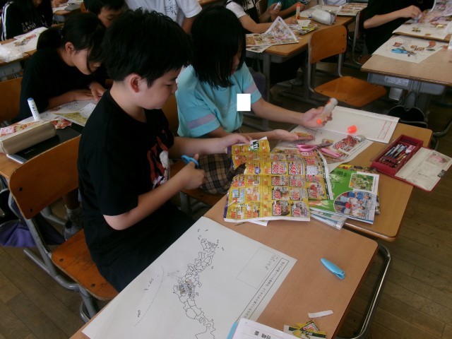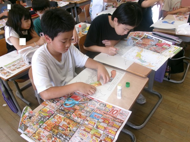 今日は、自分たちが普段食べている食材がどこから来ているのかチラシを使って調べました。野菜は日本で作っているが、肉類は外国から輸入しているものが多いことに気付きました。