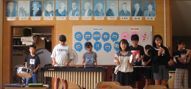 いろいろな楽器を担当し、みんなで合奏を楽しみました。よい演奏になっていました。