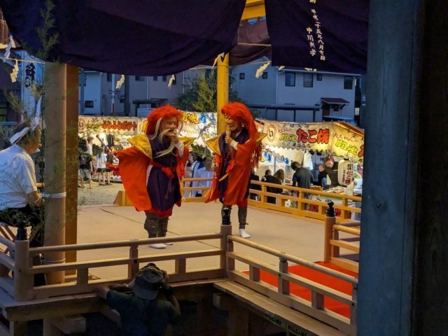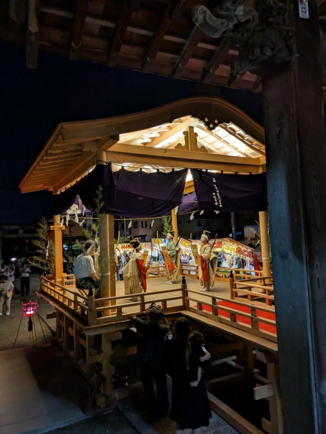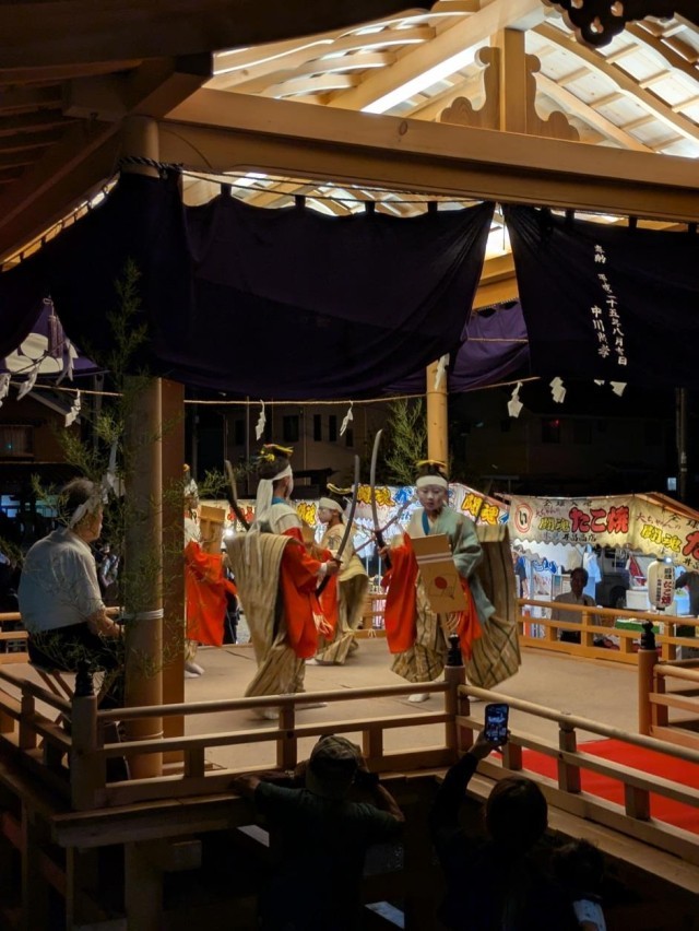 多くの人の見守る中、舞台の上では大稚児、小稚児が由緒正しく、舞楽を奉納しました。大きな拍手にとてもうれしそうな表情を見せていました。最後までがんばり抜きました。