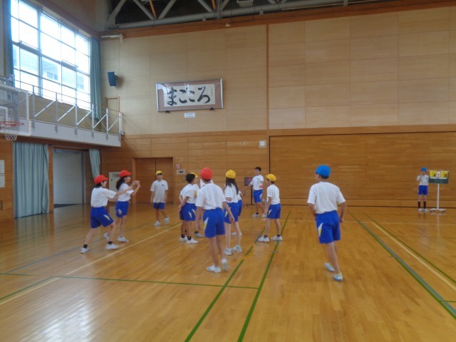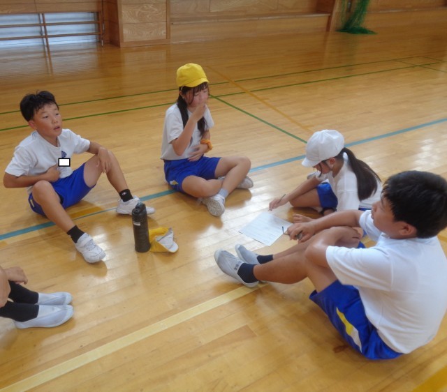 ゲームを行っているときには「もっとこっち来て!」「〇〇!パス!」など声をかけあいながら楽しむ様子がうかがえました。ゲームが終わった後にはチームごとに振り返りを行い、勝てる方法を考えました。