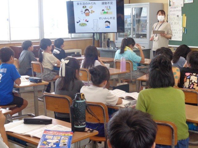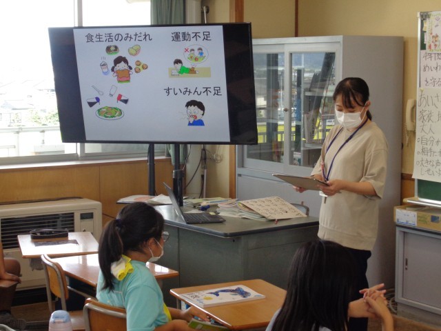 明日予定の「すこやか検診」について、養護教諭よる事前指導をしました。当日の朝食はいつもより軽く摂る、過度に不安を抱かないなど、スライドを用いて分かりやすく説明しました。