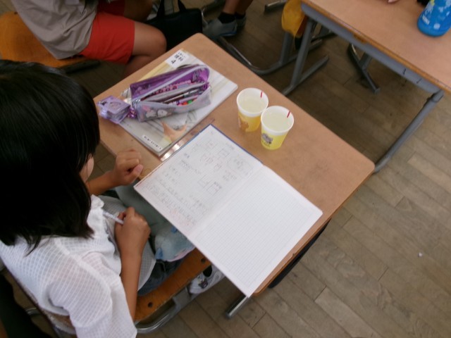 理科の授業では、入れ物の水が空気中に出ていくのかどうかを調べました。結果がどうだったのかを自分なりにノートにまとめました。