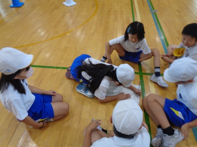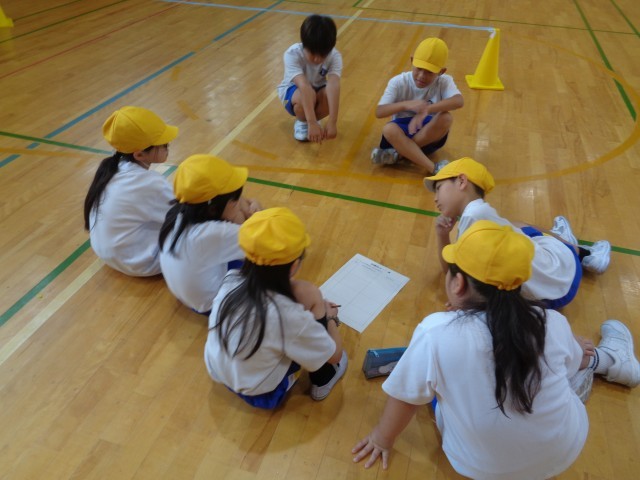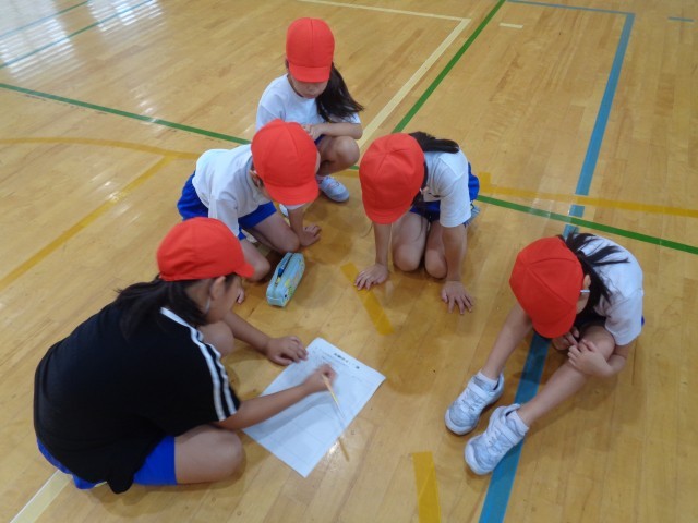 体育の学習では、フロアボールに取り組んでいます。最初は難しそうにしていた子供たちも徐々に慣れてきてチームで作戦や目当てを考えました。