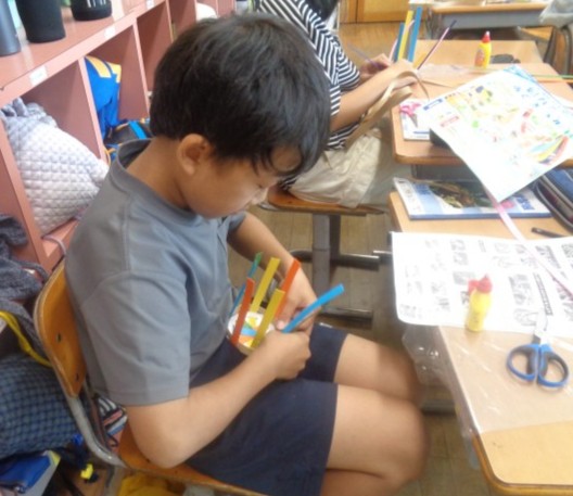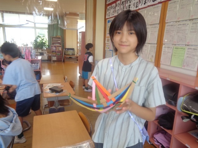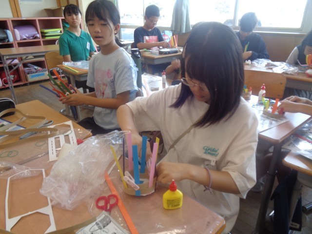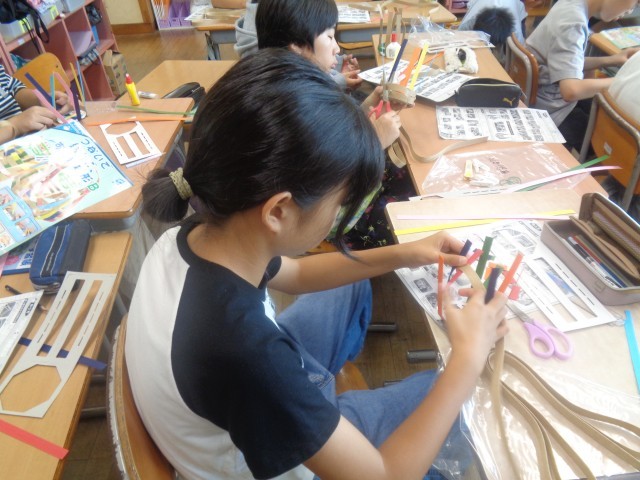 図画工作科「つないでくんで」では、紙を繋いだり組んだりして籠や入れ物を作っています。