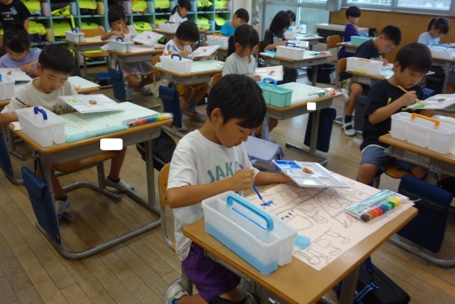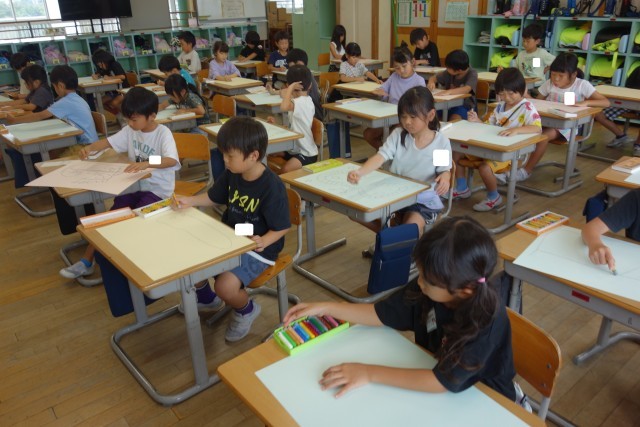 図画工作科の学習の様子です。自分が選んだ本の好きな場面を絵に表します。