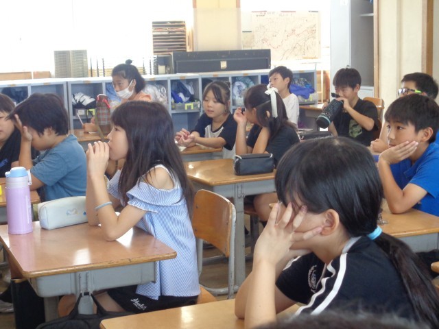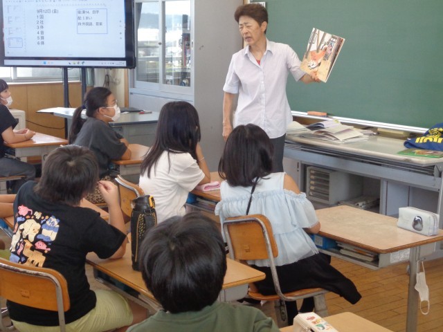 「シバ犬のチャイ」と「ジオジオのかんむり」の読み聞かせをしていただきました。子供たちは、話に引き込まれて聞いていました。