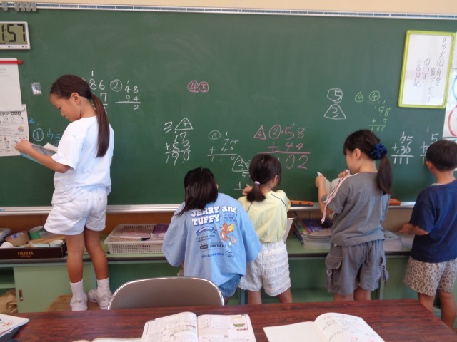 2つ繰り上がりのあるたし算のひっ算です。まとめに、子供たちに黒板に書いてもらいました。果たして、あっているでしょうか。