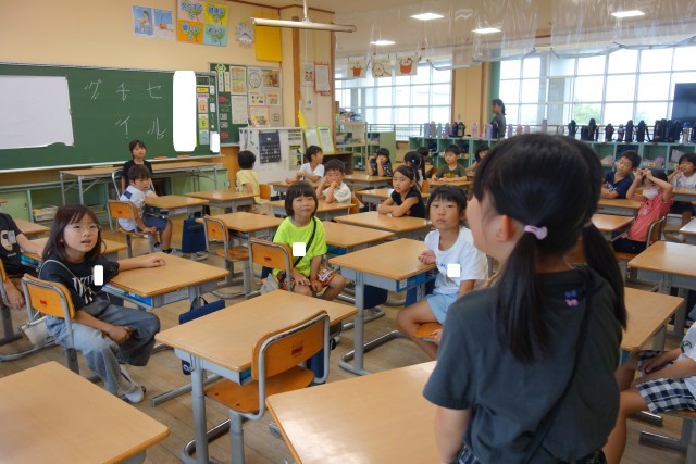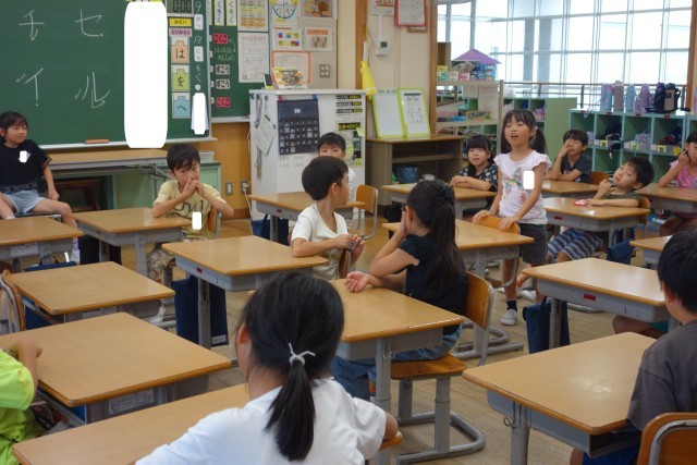 朝の聴き合い。「休日の朝は10時まで寝て、遅い朝ごはんを食べる」というAさんの話題をもとに、自分の休日の朝の過ごし方を思い出す子供たち。