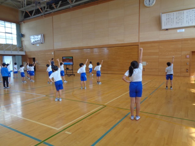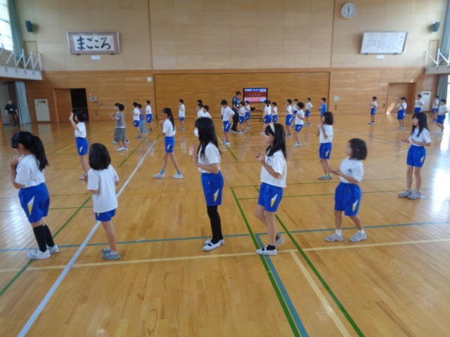 学習発表会での全員ダンスを、リズムに合わせて全体が揃うように、手の動きや位置などを繰り返し確認しています。その後、各グループに分けれて仕上げに向けて練習しました。