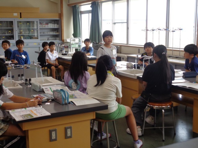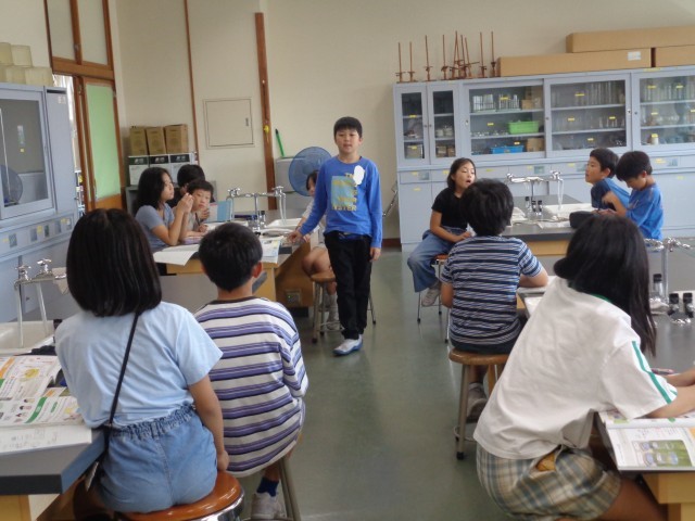 9月18日に観察を始めた「おおいをしたビーカー」と「おおいをしないビーカー」。5日目の今日は、明らかに「おおいをしないビーカー」の水の量が減っていました。そのわけについて班で話し合い、それを全体に伝え合って考えをまとめました。