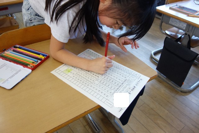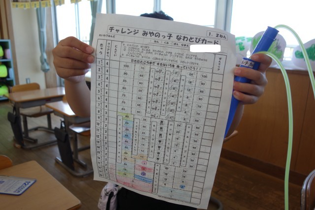 休み時間の度に、子供たちは「なわとびカード」を見せに来てくれます。たくさんチャレンジして、どんどん塗り進めています。
