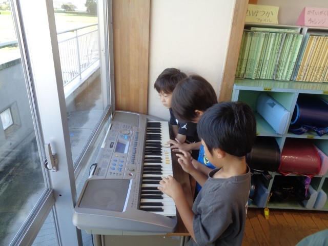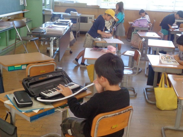 登校後、学習の準備を終えて学習発表会の練習をする子供たちです。秋の場面「村祭り」の鍵ハの演奏が難しいようです。個人練習に勤しんでいました。