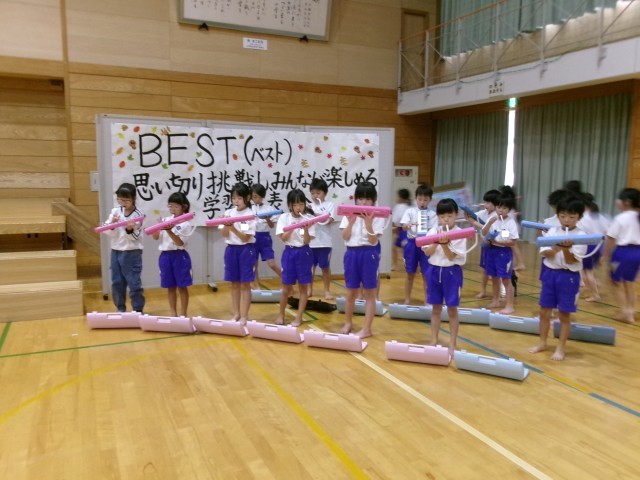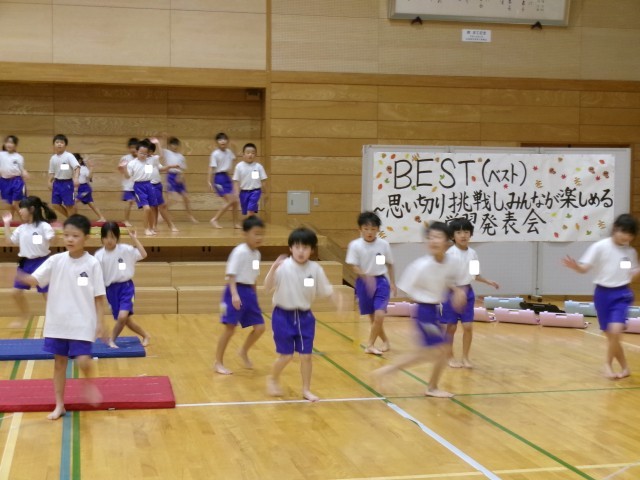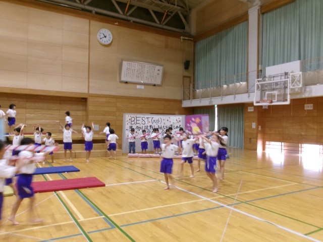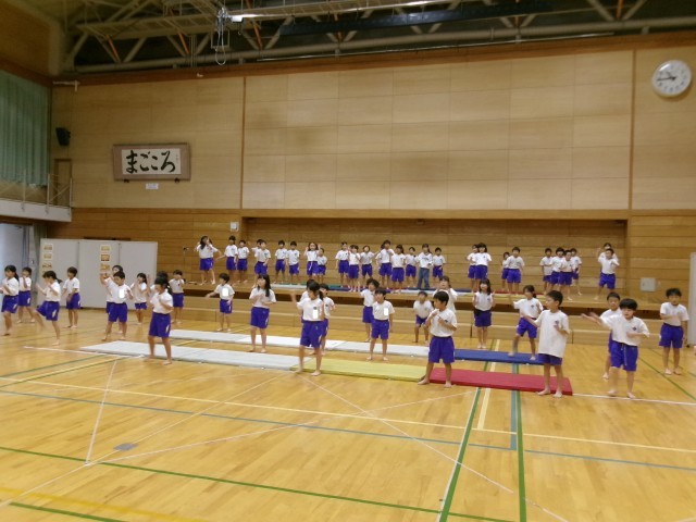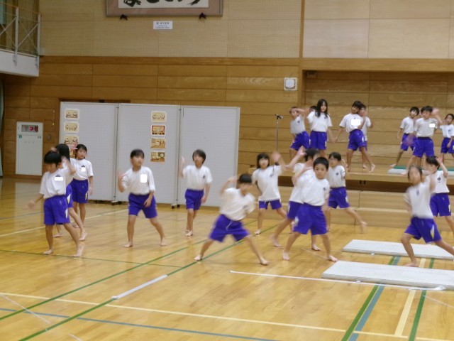 学習発表会の表現の流れをつかんだ子供たち。今日は、生き生きと活動していました。一つ一つの技の精度が上がってきましたが、子供たちからは、「もっとマットを練習したい」「友達と合わせて組体操をしたい」などの意欲的な声が聞かれました。
