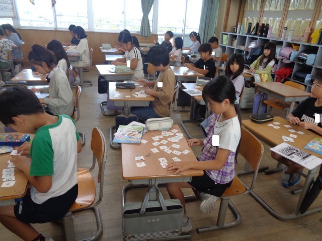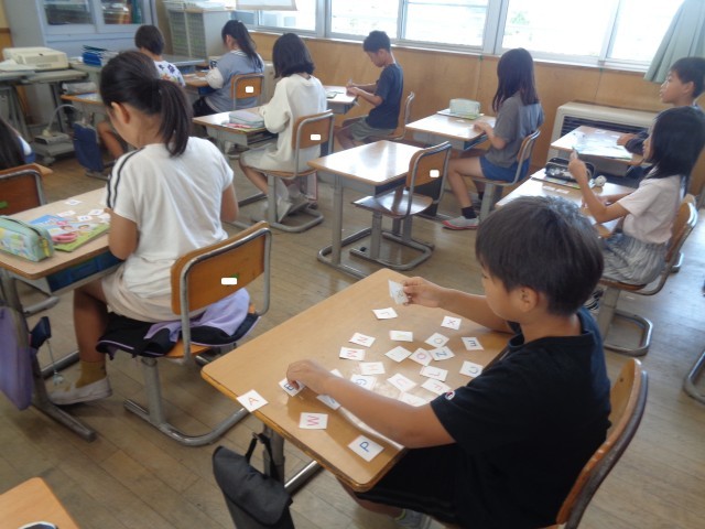 外国語活動では、アルファベットが書かれたカードを使って学習に取り組んでいます。