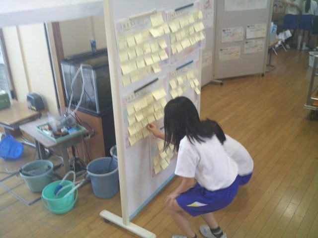 全学年の発表を見た5年生。各学年にそのよさを伝えるメッセージカードをつくりました。