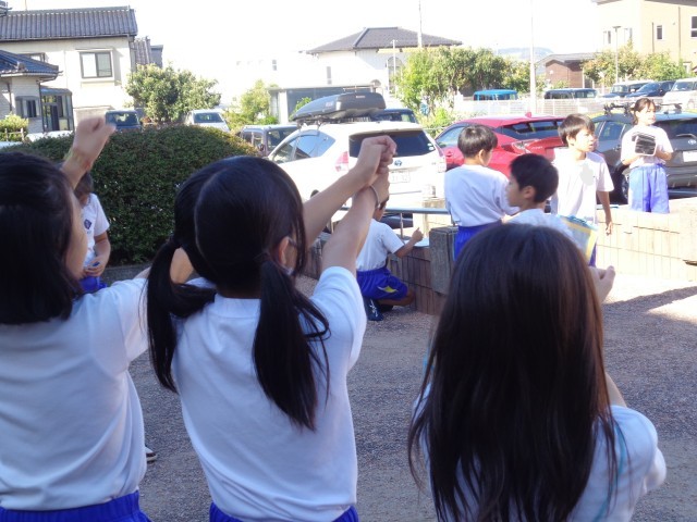 先日は中秋の名月を、それぞれの家庭で観察した子供たち。今朝は、青空に月が見えたので観察しました。保育所の建物の左側に白い月があり、時間がたつと西の空に沈んでいく様子が分かりました。