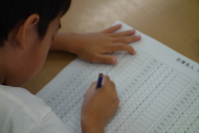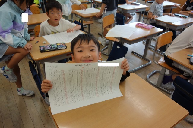 計算名人プリントにチャレンジ。5分間で100問を解きます。2回目は、1回目を超えられるようにがんばります。100問全て解き終えた児童もいました。