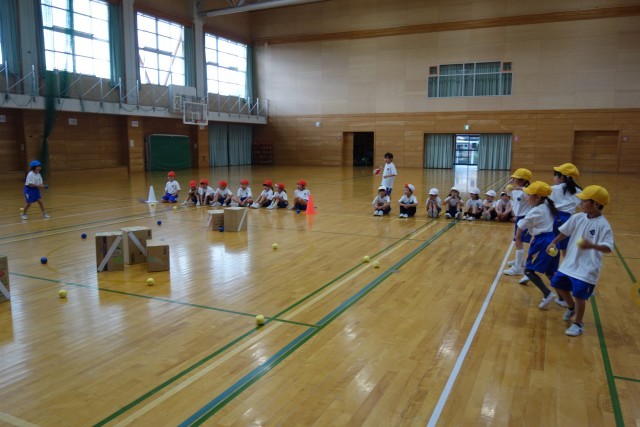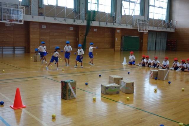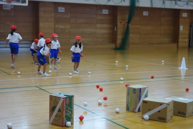 体育科「ボールなげゲーム」の学習の様子です。ルールや学習の流れを理解した子供たち。今日は、1次リーグで自分たちの力を試しました。