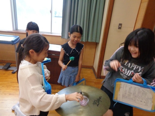 楽器から音が鳴る時に楽器が震えると予想した子供たち。
