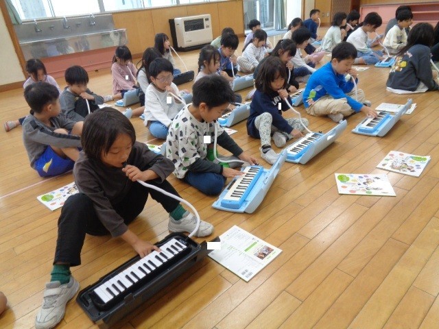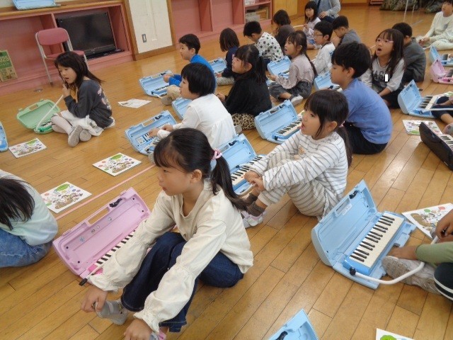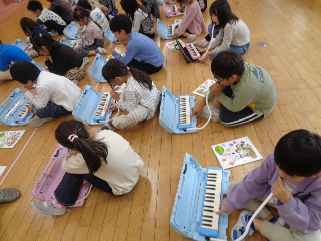 音楽の時間では、歌を歌ったり、ドやソの位置を確かめながら鍵盤ハーモニカを弾いたりしました。