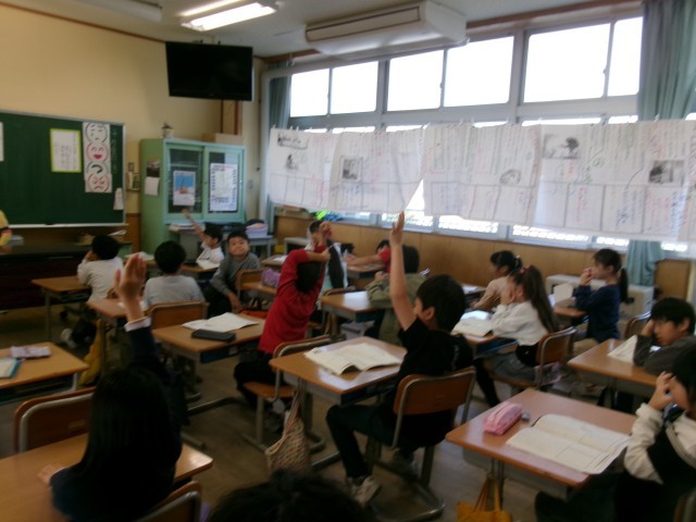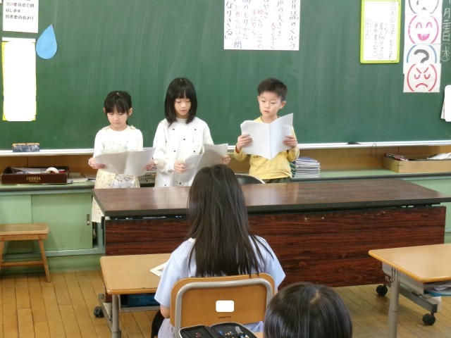 「お手紙」の朗読です。最後のグループが登場人物になりきって、見事な朗読をしました。やはり、練習を重ねるごとに上手になっています。朗読を聞いた子供たちの感想も「声の大きさの工夫があった」「〇〇さんが、かえるくんになりきっていた」など、聞く観点がしっかりしてきました。