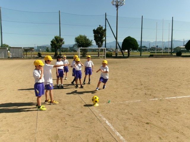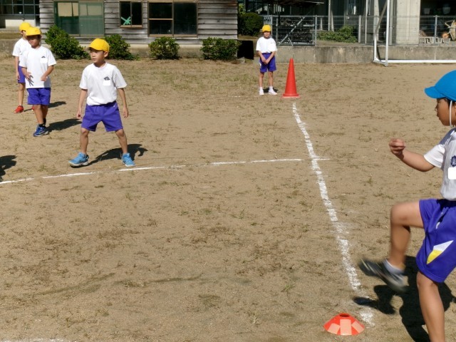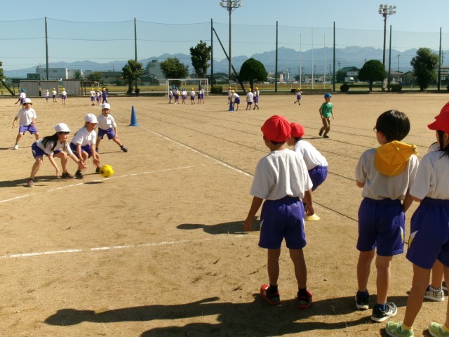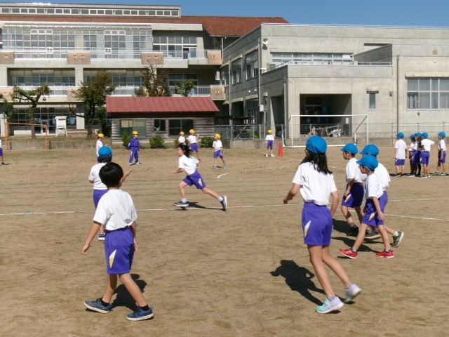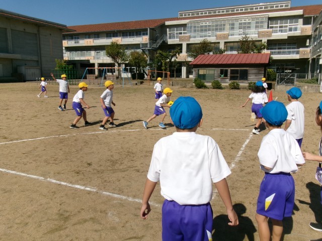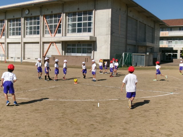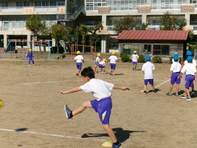 気持ちのよい秋晴れの下、久しぶりにグラウンドで体育を行いました。「キックベースボール」です。聞きなれない言葉に戸惑う子供たちもいましたが、ルールは、いたって簡単です。「いくぞ!」の掛け声とともに、ボールを蹴って1塁のコーンまで、ボールよりも速く走るだけです。野球のスポーツ少年団に所属している子供たちがルールを教えてくれて、和やかな雰囲気でキックベースボールを楽しみました。子供たちがゲームに慣れるにつれて、ルールを工夫していきます。