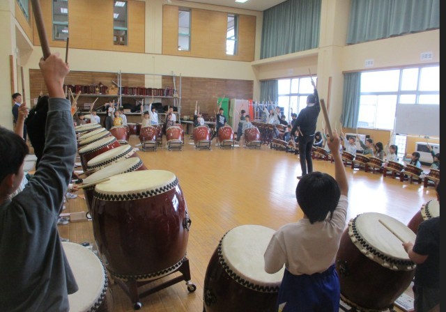 指導の先生の合図に従って、みんなで心をそろえて太鼓をたたきました。