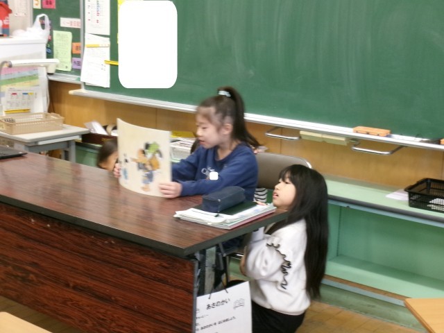子供たちが楽しみにしている「仲間」による読み聞かせです。読み手の子供たちの声も大きくなり、読みに抑揚がでてきて、とても上手になってきたような気がします。これも、国語「お手紙」の成果でしょうか。