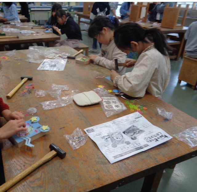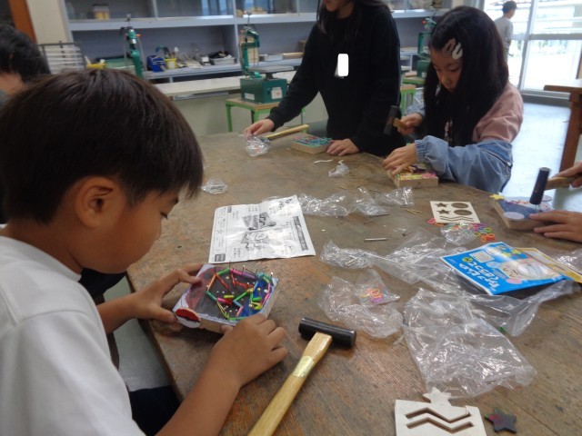 最初はまっすぐ打つことに苦戦している子供たちでしたが、徐々にコツをつかんでいき、最後まで打ったり途中の高さでとめたりするなどして、釘の高さを変えて楽しんでいました。