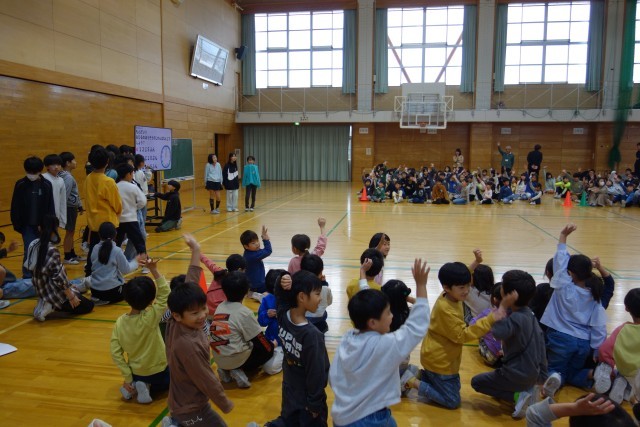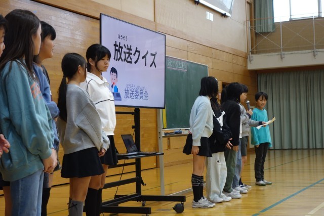 秋の児童集会の様子です。放送委員会は、「放送」に関するクイズを全校のみんなに出題しました。「放送クイズ」は、少しでも全校のみんなが放送に関心をもってほしいという思いが込められています。