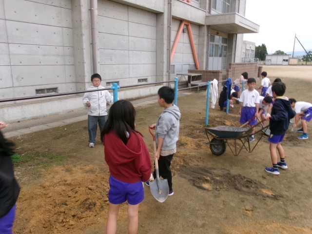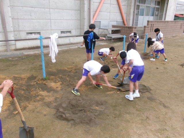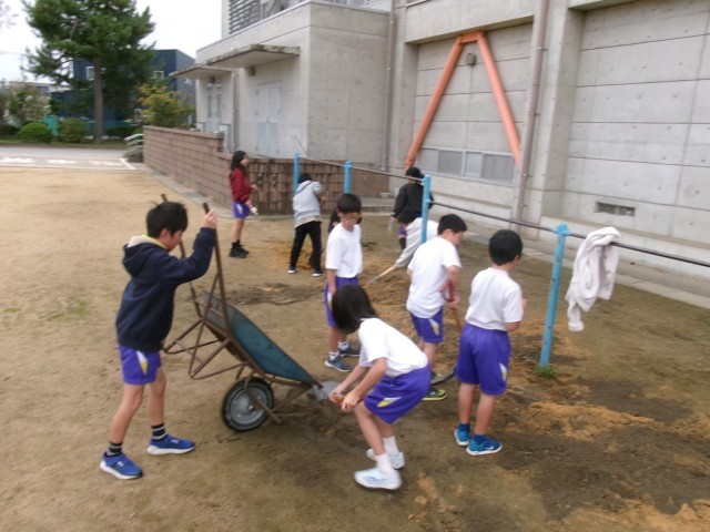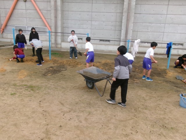 これから体育の時間で使うと鉄棒を、落ちてもけがをしないように自分たちで地面をふかふかにしました。自分たちのことは自分たちでやる。これからの鉄棒の時間を楽しみにしながら取り組む姿が見られました。