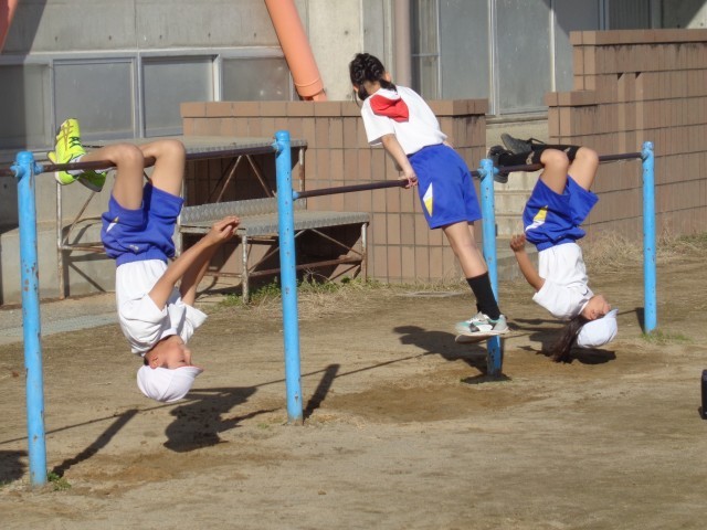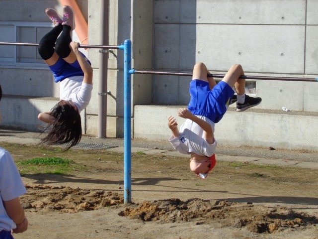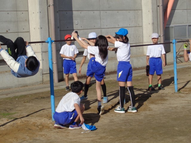 鉄棒では、「両ひざかけ倒立(こうもり)」、「両ひざかけ振動(こうもりふり)」に取り組みました。互いに教え合ったり、補助し合ったりするなど、意欲的に行いました。「両ひざかけ振動下り(こうもりふりおり)」に挑戦する姿も見られました。