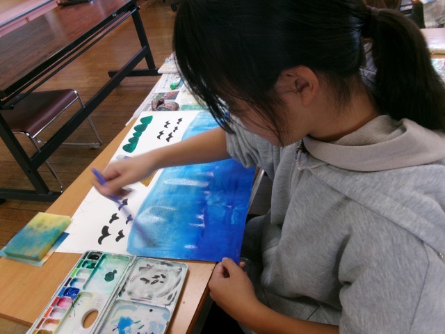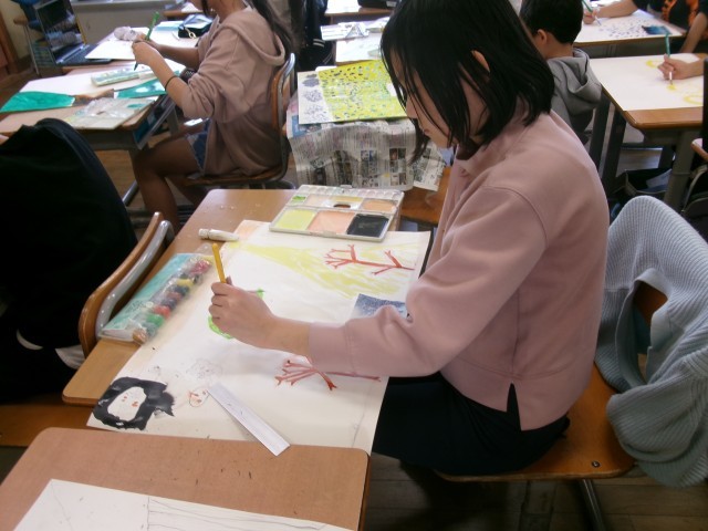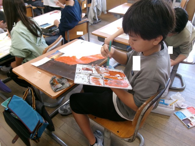 今日の図画工作科では、一枚の写真の外側にはどのような世界が広がっているかを想像し、絵で表しました。自分が描き表したいものを表現するために必要な筆の使い方を自分で選び、着色しました。