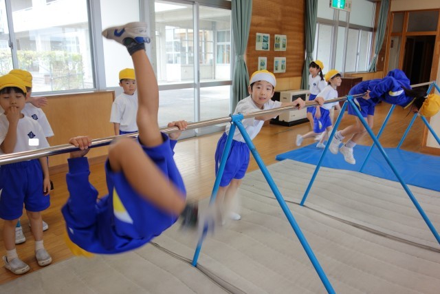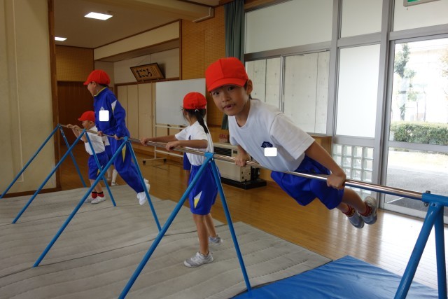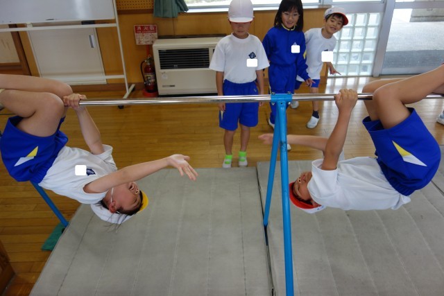 鉄棒の練習の様子です。友達と技を見せ合いながら、楽しんで学習に取り組む様子が見られました。