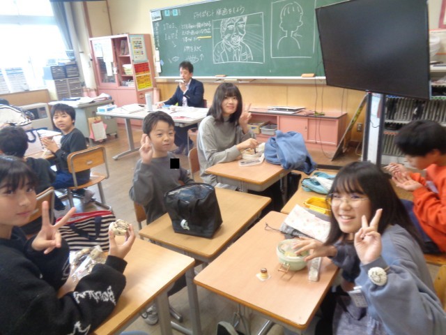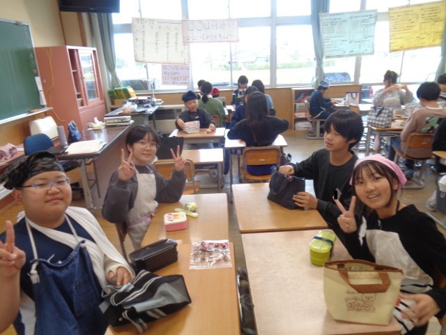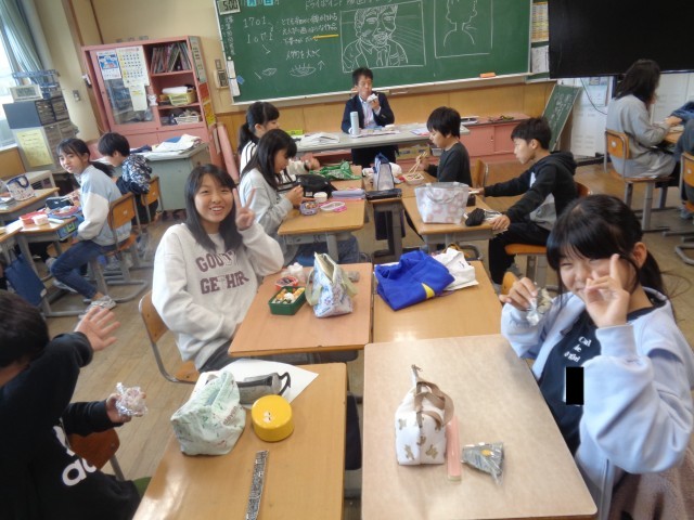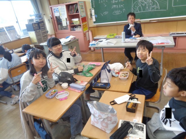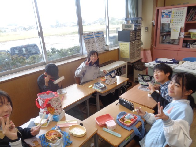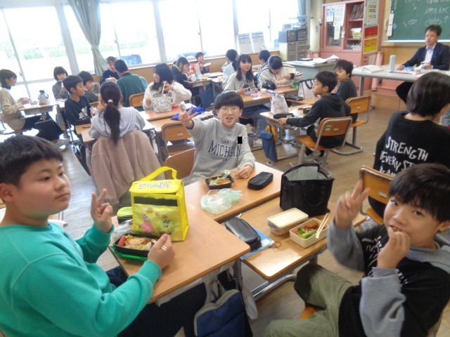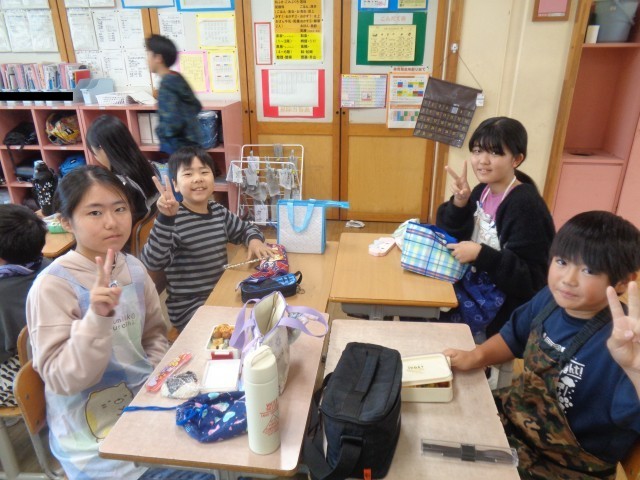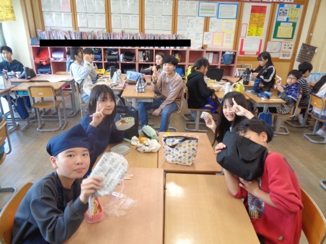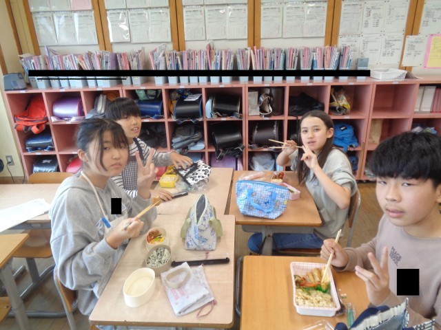 今日のお昼は保護者の方にご用意いただいたお弁当を食べました。班のみんなと仲良く食べていました。