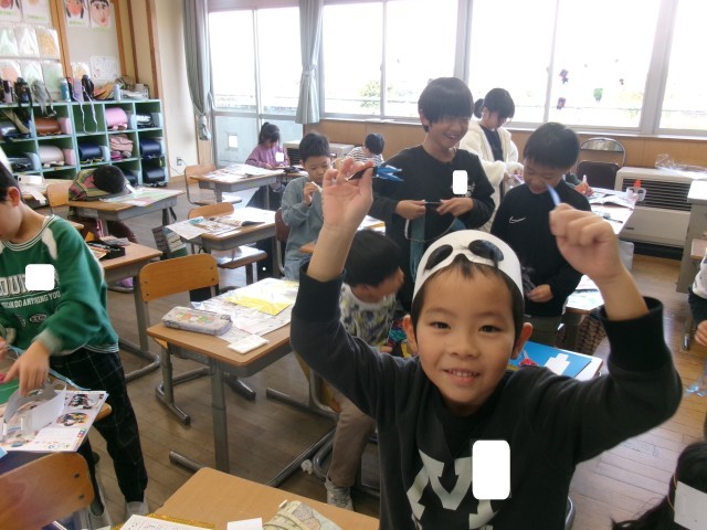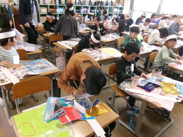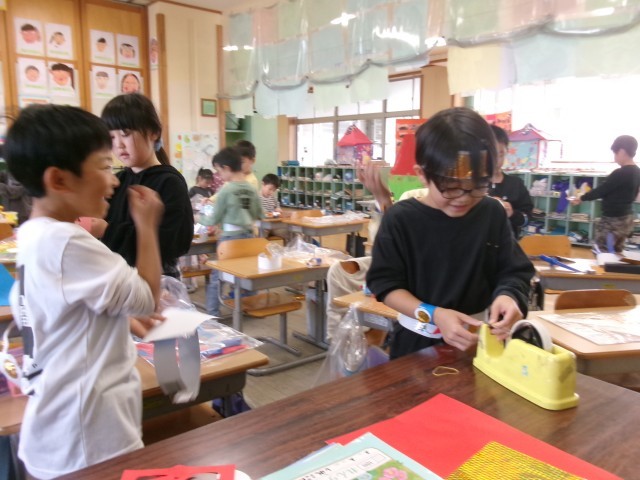 2年生 図工「わっかでへんしん」変身中!