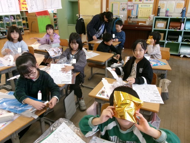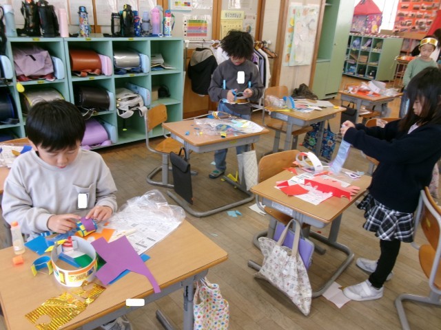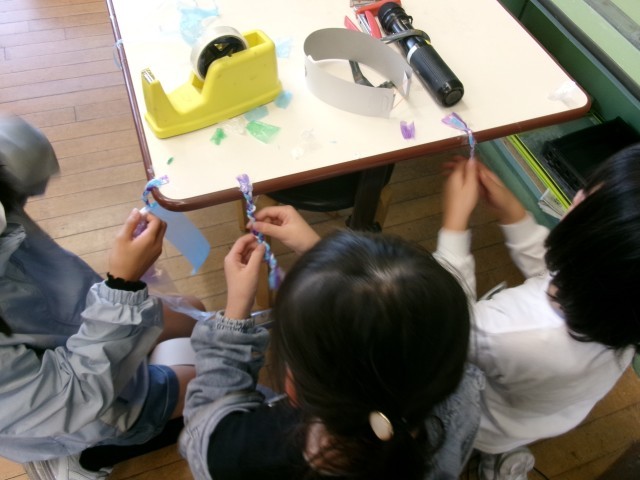 「わっかでへんしん」で何に変身するか、飾りを付けながら考えています。飾りを作っては腰のベルトや冠に張り付けてみて、さらに考えて飾りを付けたしています。間もなく完成予定します。子供たちの変身ぶりが楽しみです。