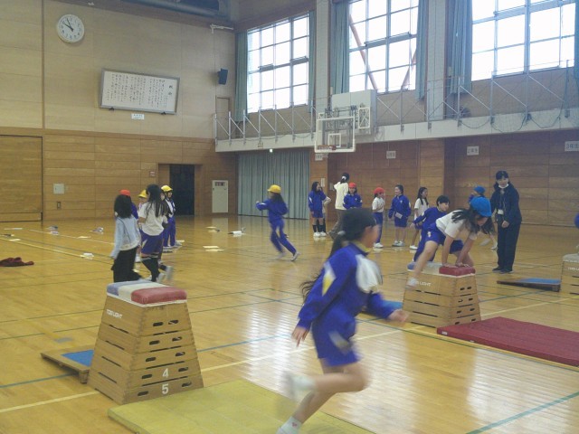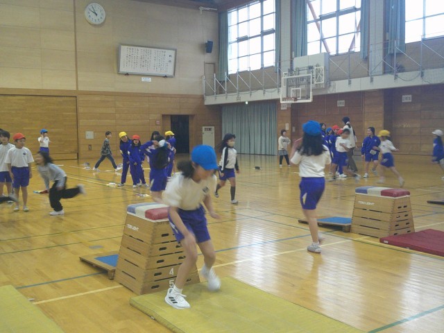 体育科では、「跳び箱運動」の学習をしており、開脚跳びと、台上前転に挑戦しています。