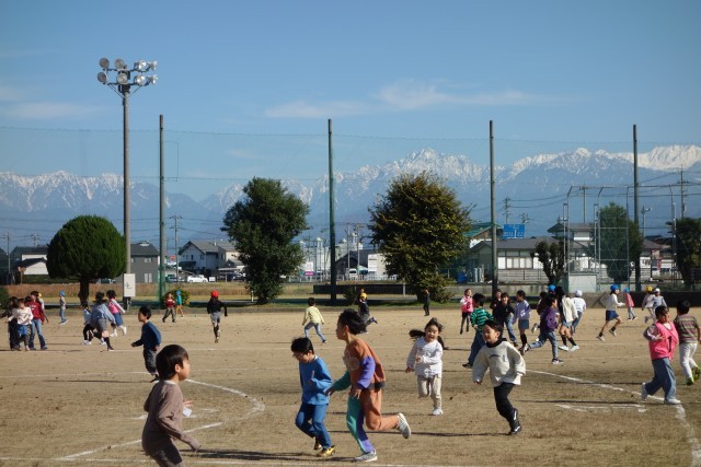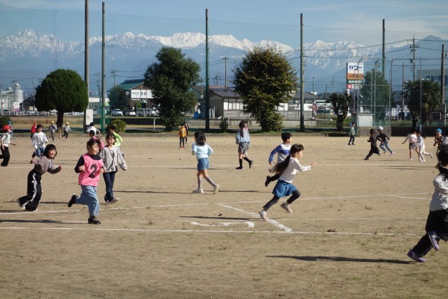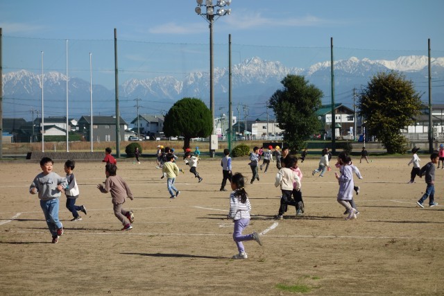 昼に運動委員会のイベント「逃走中」に参加する1年生の子供たち。美しい立山連峰をバックに、宮野っ子たちが元気よく走り回っていました。