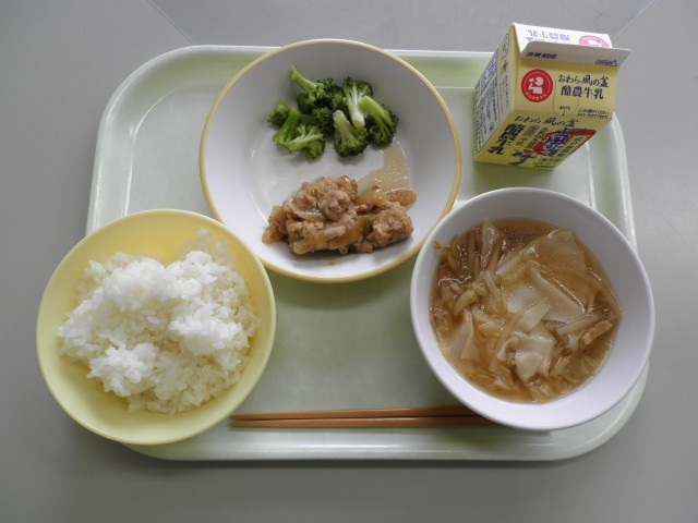 献立名:ごはん 牛乳 豚肉のおろし炒め ゆでブロッコリー ワンタンスープ