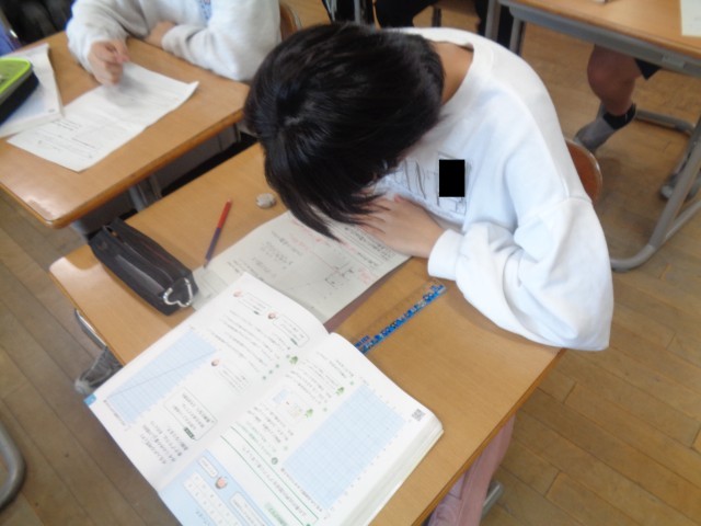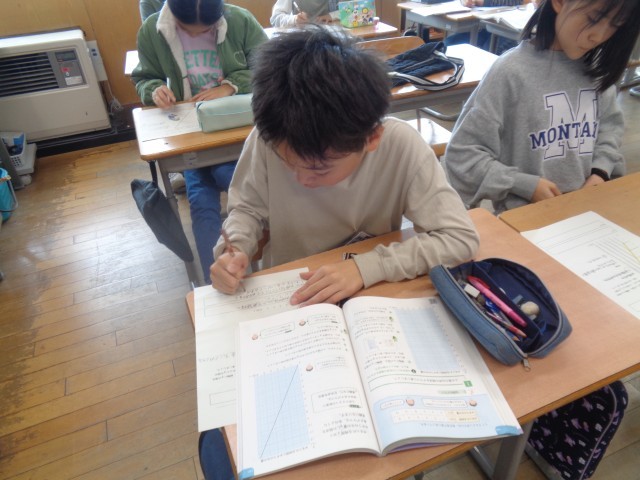6年生算数科比例の学習では、比例をグラフで表しました。「書くのが難しい!」と言いながらも一生懸命に書いていました。